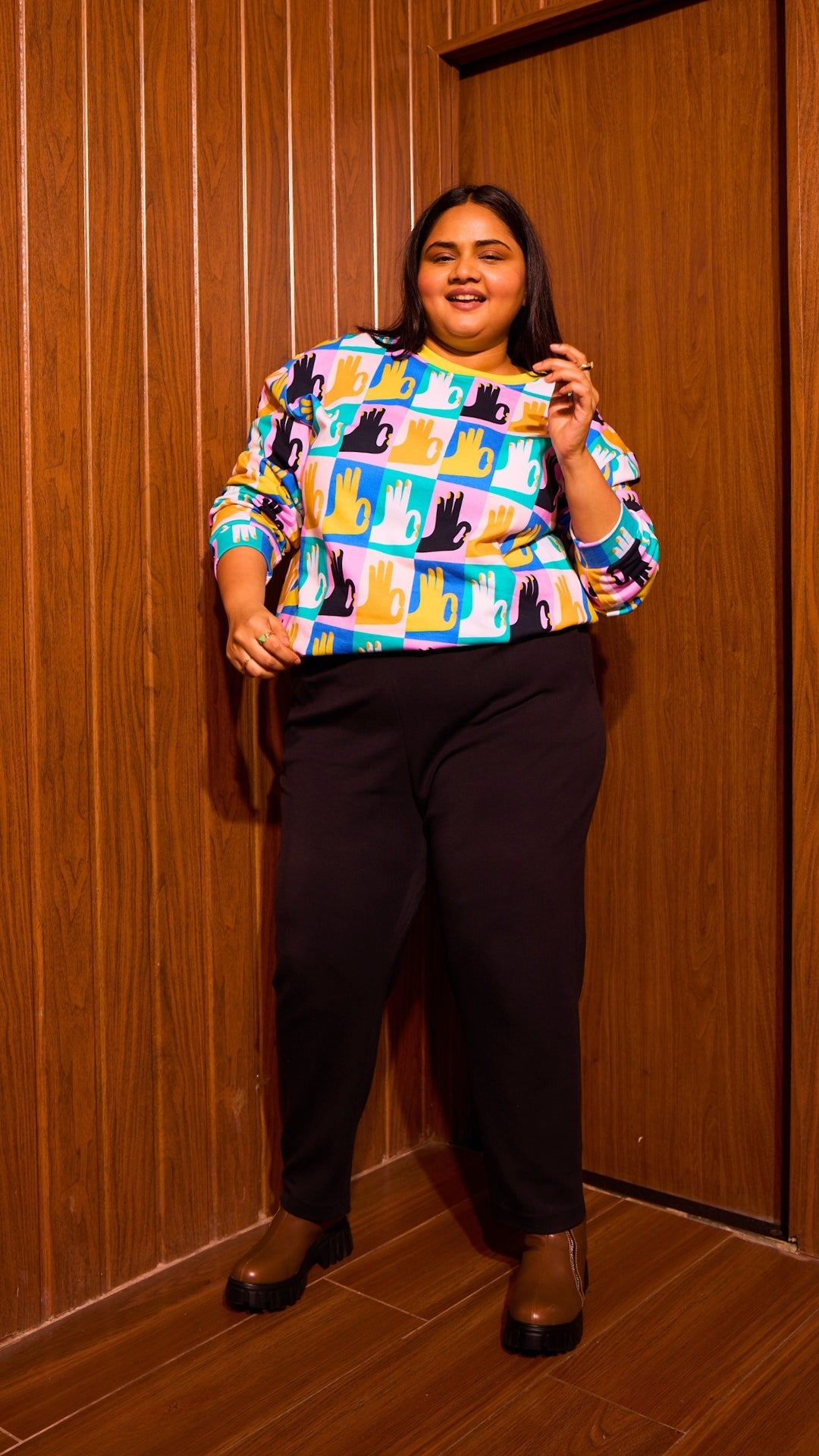 - Hands up if your vibe is immaculate — Vibe Check is a riot of multicolor pop hands flashing the “OK” in a bright grid of confidence. Bold, graphic, and unapologetically fun.