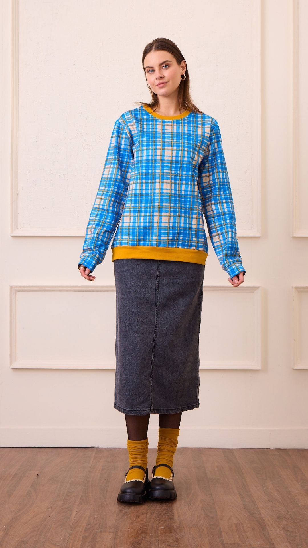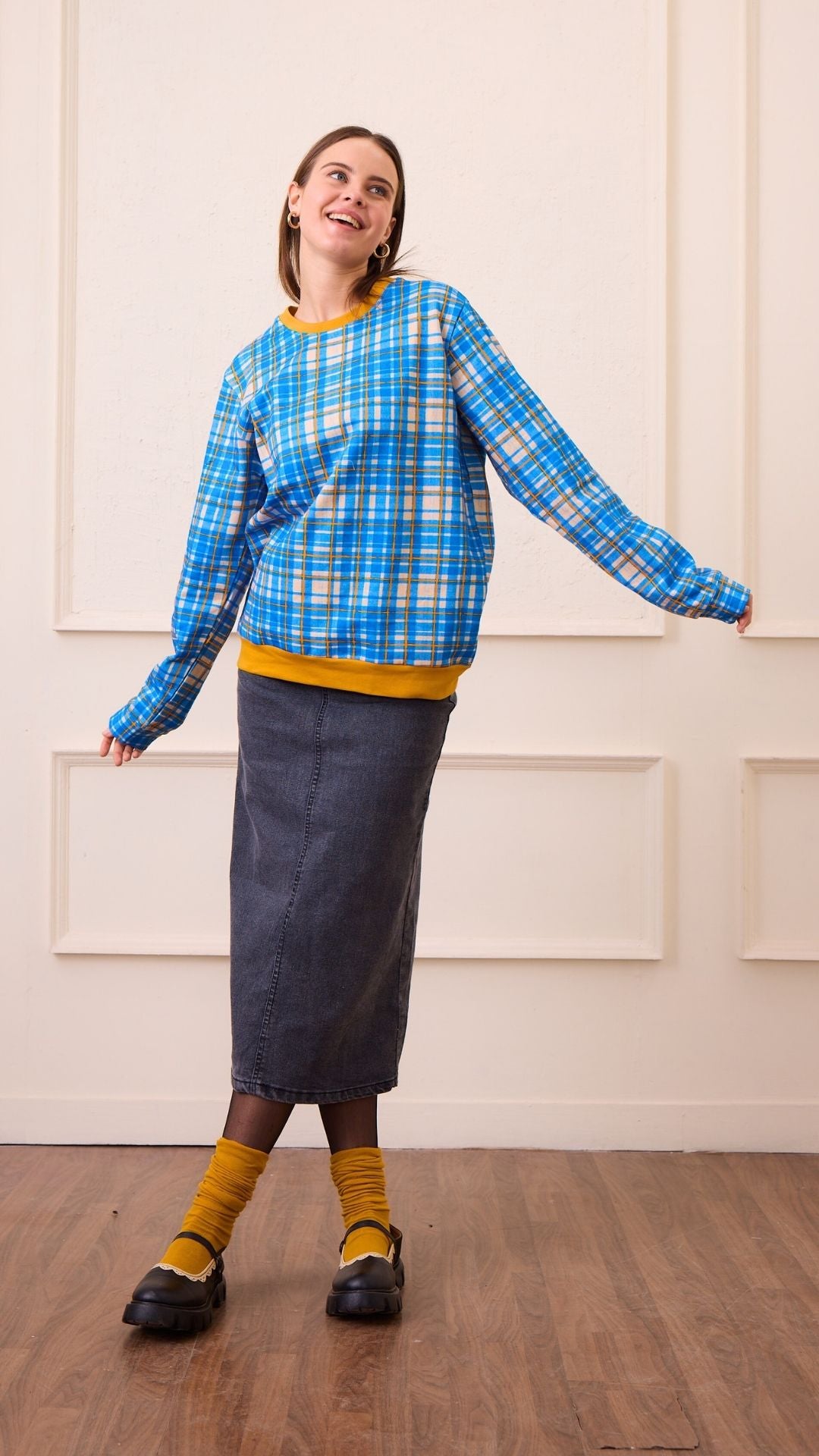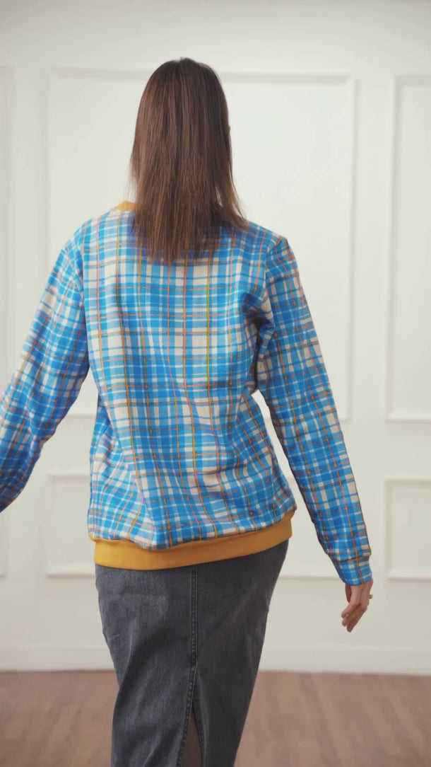 • Classic plaid, made modern, in this geometric interpretation of the sky, Before Golden Hour; that perfect in-between moment — soft blue light, golden edges, and an easy sense of calm.